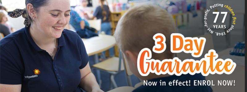 We’re open from 6am – 9:15am for Before School Care with breakfast provided, 3:00pm – 6:00pm for After School Care with afternoon tea provided and 7:30am – 6:00pm during Vacation Care.